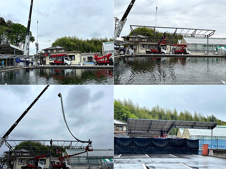 栃木県の小山市にて、釣り堀エリアに雨除けとしてテント上屋の新設工事を行いました。今回は以前よりお取引させていただいている会社様から、別のエリアにもテント上屋を設置したいとのご相談をいただきました。