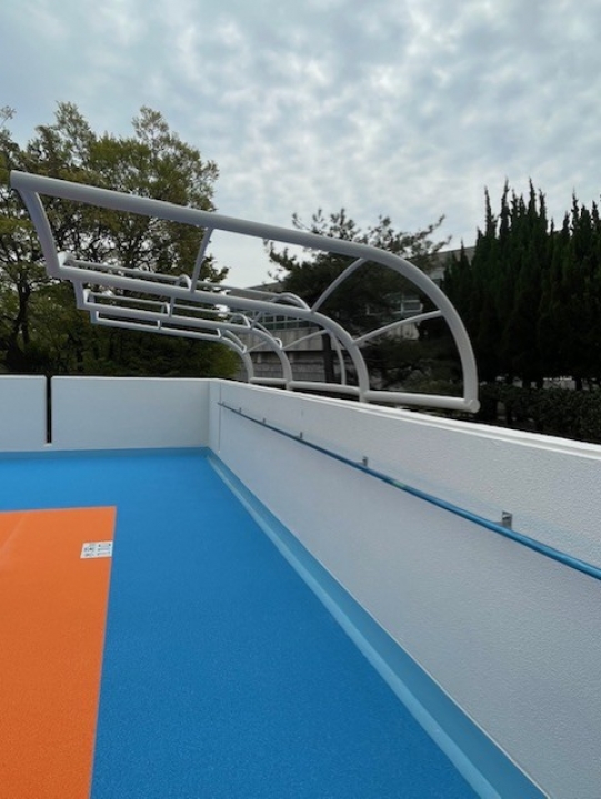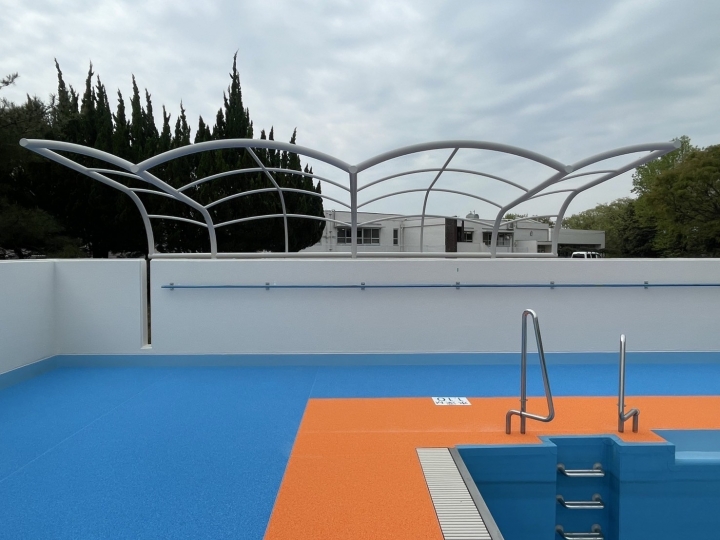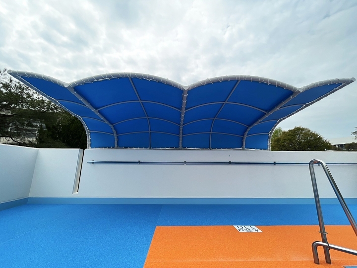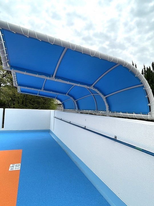 某施設のプールサイドにデザインテントを設置させていただきました。